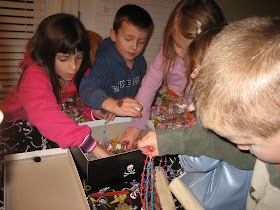 Here is a picture of the kids after they found the treasure chest. My husband spray painted a shoebox black and I embellished it with skulls and crossbones and filled it will beaded necklaces, jeweled rings, gold coins, plastic snakes and spiders, eye ball bouncey balls and lots of spookycandy that I got 75-80% off at after Halloween sales. It was a really cool treasure chest but the picture doesn't do it justice.